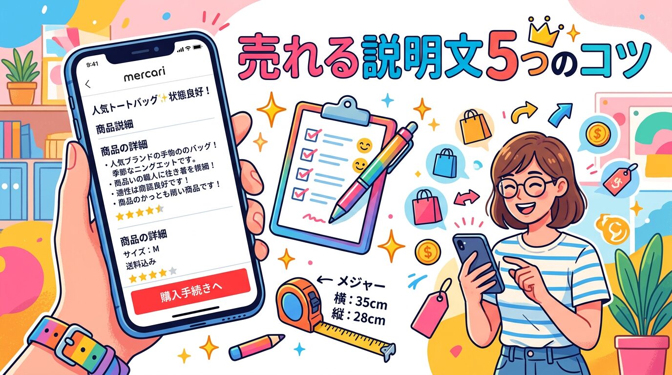 メルカリで「いいね」はつくのに売れない。そんな経験ありませんか?原因の多くは商品説明文にあります。この記事では、購入率を上げるための説明文テクニックを5つ紹介します。