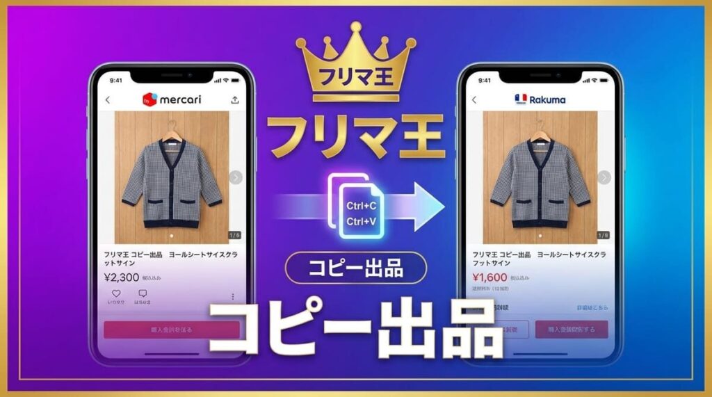 フリマ王 コピー出品とは 「フリマ王 コピー出品」は、メルカリ・ラクマなどの商品情報をワンクリックでコピーし、自分の出品に反映できるブラウザ拡張機能です。タイトル・説明文・カテゴリー・価格・配送方法・画像まで、出品に必要な全項目をまるごとコ...